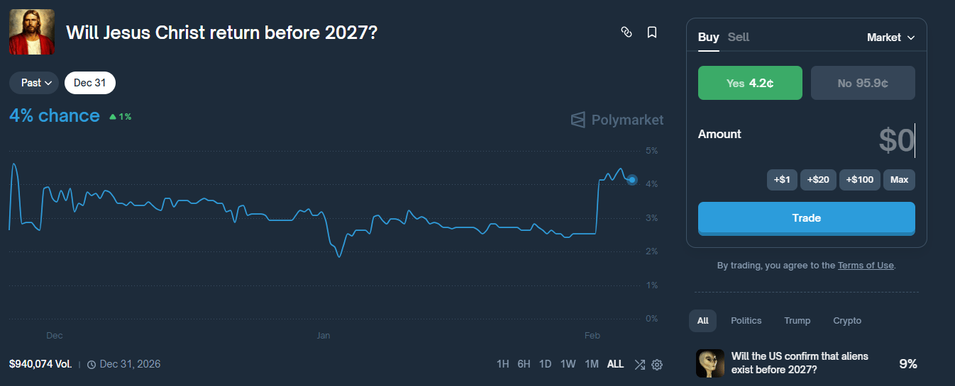 The odds of Christ's Second Coming occurring before 2027 currently sit at 4.2%.
